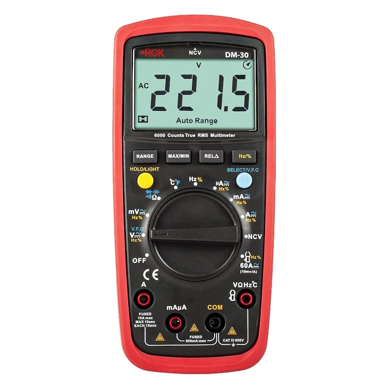 Цифровой мультиметр RGK DM-30 измеряет напряжение до 600 В, постоянный и переменный ток до 10 А, сопротивление 0,6 кОм–60 МОм, частоту и коэффициент заполнения. Измеритель также может использоваться для проверки исправности диодов, конденсаторов и целостности цепи, измерения емкости в диапазоне 0,01–100000 мкФ и температуры от -20ºС до +400ºС, бесконтактного обнаружения напряжения в розетках и проводах. Соответствие стандарту защиты САТ III 600 В позволяет мультиметру RGK выдерживать кратковременные скачки высокого напряжения.