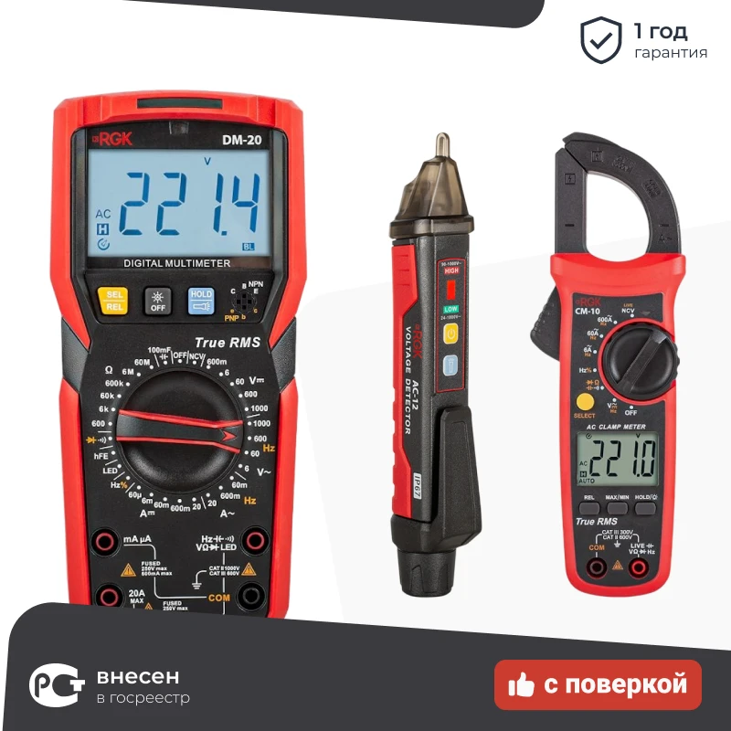 RGK DM-20 цифровой мультиметр с поверкой, с токовыми клещами CM-10 и индикатором напряжения AC-12 779647/779678/776394 в Екатеринбурге