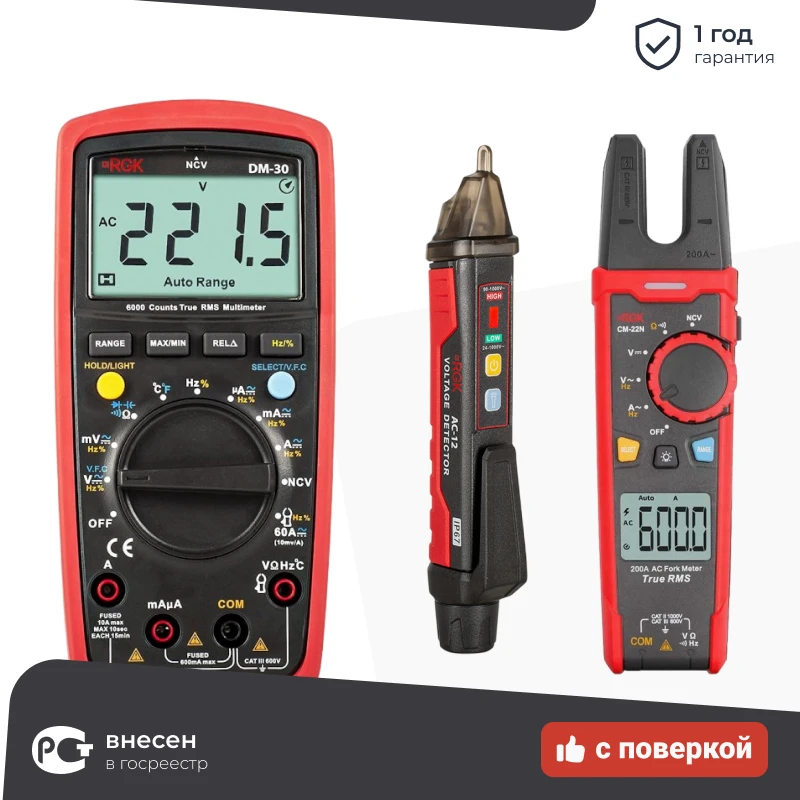 RGK DM-30 цифровой мультиметр с поверкой, с токовыми клещами CM-22N и индикатором напряжения AC-12 779654/721487/776394 в Екатеринбурге