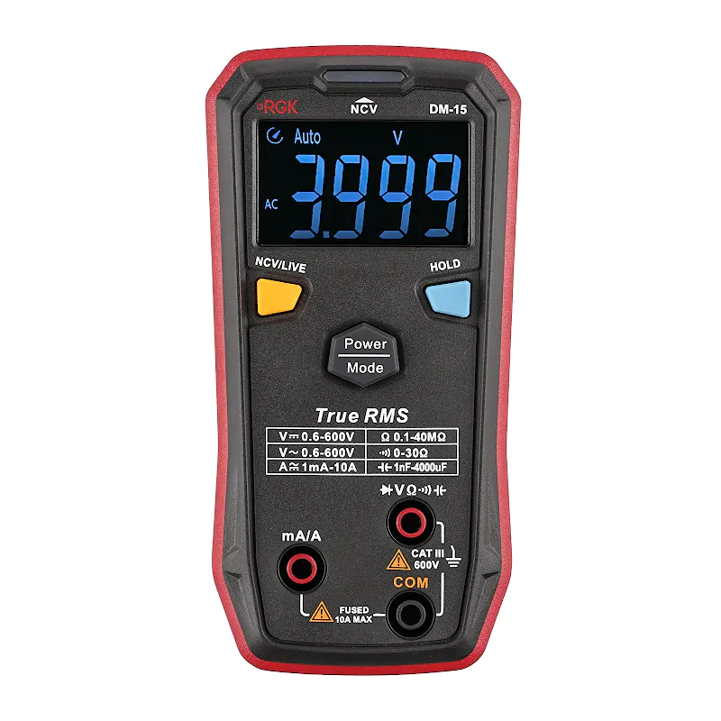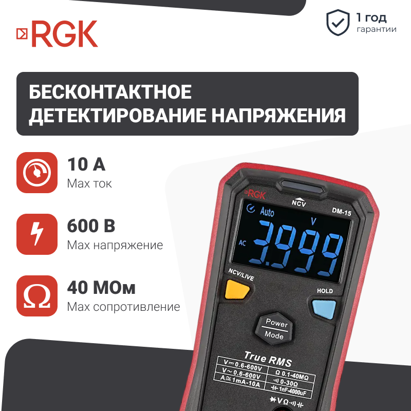 Цифровой мультиметр RGK DM-15 — компактный и легкий прибор, позволяющий выполнять измерение напряжения, сопротивления, емкости, силы постоянного и переменного тока, проверку диодов, прозвонку цепей. Функция True RMS обеспечивает высокую точность вычислений. Благодаря встроенному датчику устройство определяет наличие напряжения бесконтактным способом. Мультиметр работает от двух батарей ААА 1,5 В.