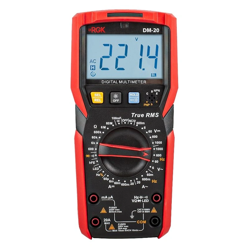 Цифровой мультиметр RGK DM-20 с поверкой - это надежный и безопасный прибор для измерения целого ряда параметров электросетей и оборудования, прозвонки цепей, тестирования различных компонентов электроприборов. Благодаря широкому арсеналу функций и измерительных режимов эта портативная модель может использоваться как в быту, так и в таких профессиональных отраслях, как строительство, сервисное обслуживание и др.