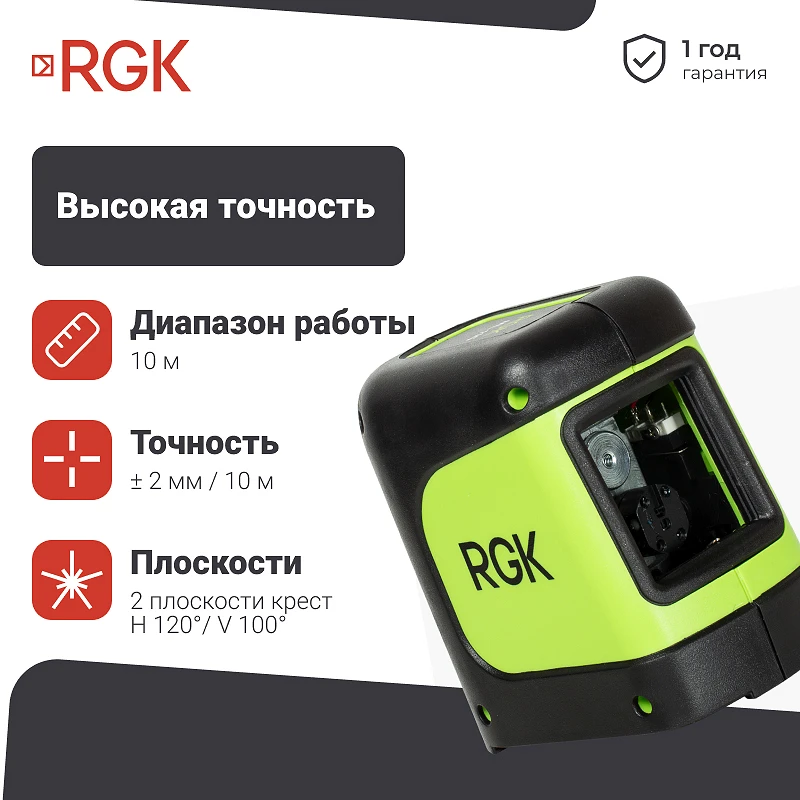 Лазерный построитель плоскостей RGK ML-11G питается от батареек типа АА. Одного заряда хватает до 6 ч непрерывного использования модели.