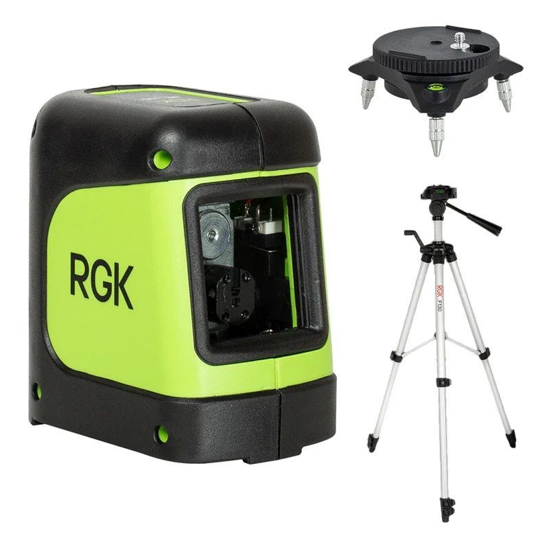 Лазерный уровень RGK ML-11G со штативом F130 и кронштейном K-3 — комплект оборудования для строительных и ремонтных работ. Нивелир выстраивает два луча зеленого цвета: горизонтальный и вертикальный. Поставляется с батарейками и транспортировочной сумкой.