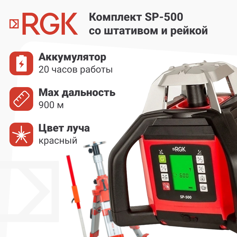 Ротационный нивелир RGK SP-500 – профессиональный инструмент для построения горизонтальной или вертикальной плоскости на дистанции до 900 м с применением приемника. Комплектуется штативом RGK SH-170 и нивелирной рейкой RGK LR-2, образуя готовое к работе решение для точных геодезических измерений. Модель оснащена дисплеем для удобной настройки и отличается высокой автономностью.